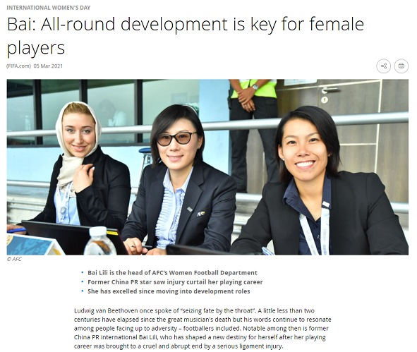 国际足联女足官员萨拉·巴里曼说,白莉莉通过她的工作,赢得尊重和钦佩。“我希望看到更多像她一样的前球员参与女足管理工作。”