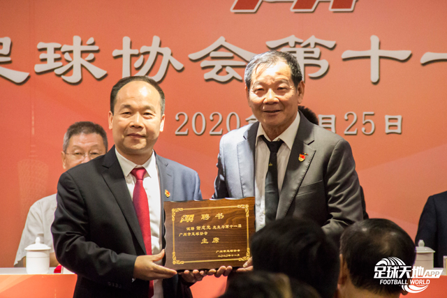 △ 广州市体育局党组书记、局长欧阳资文向新当选的广州市足球协会主席谢志光颁发聘书。