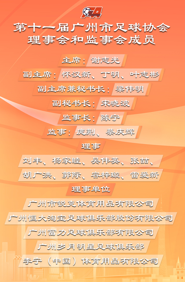 11月25日,广州市足球协会第十一届第一次会员大会在越秀山体育场召开。大会听取了广州市足球协会第十届理事会工作报告、财务工作报告、监事会工作报告,修改并表决通过了广州市足球协会章程,选举产生了广州市足球协会第十一届理事会成员、监事会成员。