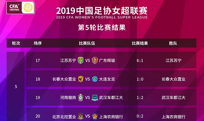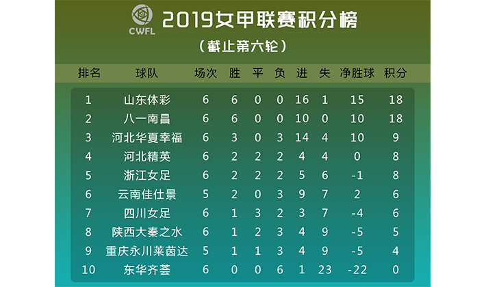 2019年8月3日至4日,2019中国足球协会女子足球甲级联赛第六轮结束其中四场比赛的争夺,重庆永川莱茵达女足与云南佳仕景女足的比赛因天气原因延期进行。